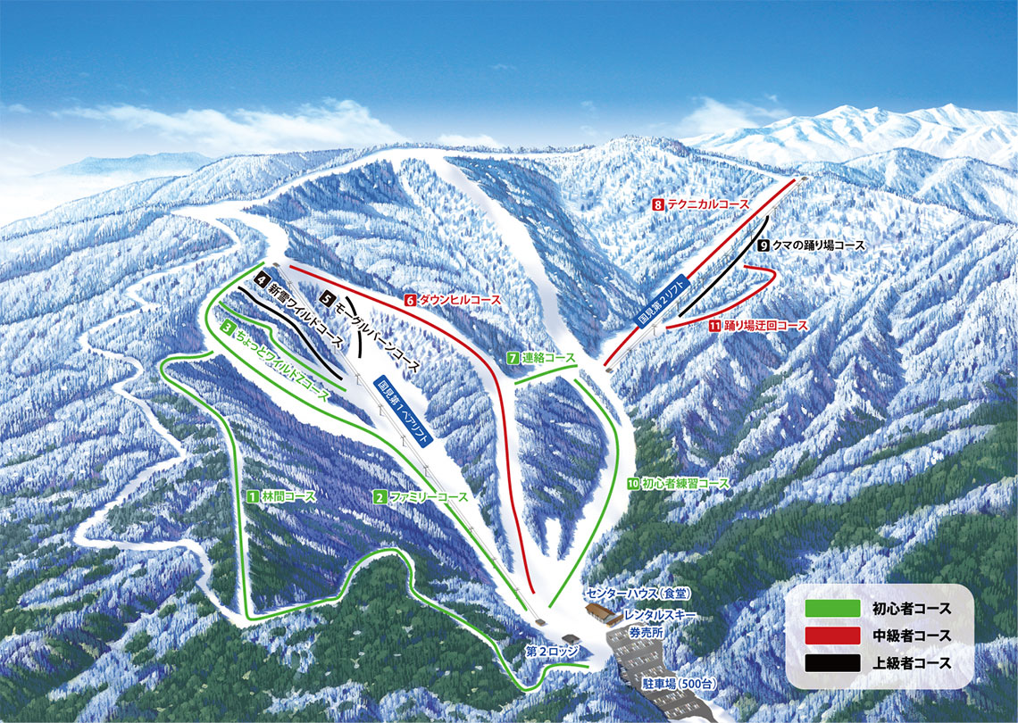 本日10:00にオープンいたします。しかしながら想定していたほどの降雪はありませんでしたので、第1ペアリフト正面のダウンヒルコースと第2リフトのテクニカルコース、踊り場迂回コースのみの滑走とさせていただきます。